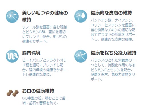原材料 大麦、とうもろこし、チキンミール(ヒスチジン源)、米、キャノーラミール(オメガ3脂肪酸源)、エンドウ豆、ラムミール、チキンエキス、シュガービートパルプ、鶏脂(リノール酸源、オメガ3脂肪酸源)、セルロース、オオバコ種皮、家禽類、フラクトオリゴ糖、STPP(トリポリリン酸塩)、コンドロイチン硫酸塩、グルコサミン塩酸塩、ビタミン類(A、B1、B2、B6、B12、D3、E、コリン、ナイアシン、パントテン酸、葉酸)、ミネラル類(亜鉛、カリウム、カルシウム、クロライド、セレン、鉄、銅、ナトリウム、ヨウ素、リン)、アミノ酸類(メチオニン)、酸化防止剤(BHA、BHT、クエン酸、ミックストコフェロール、ローズマリー抽出物)